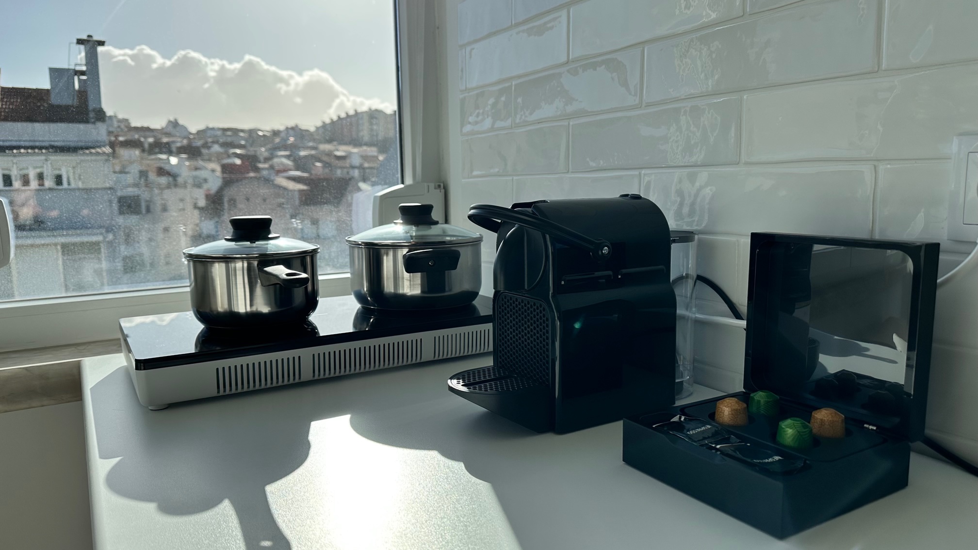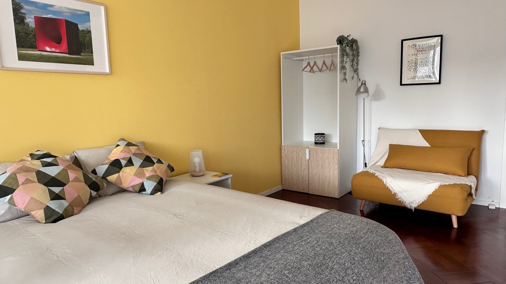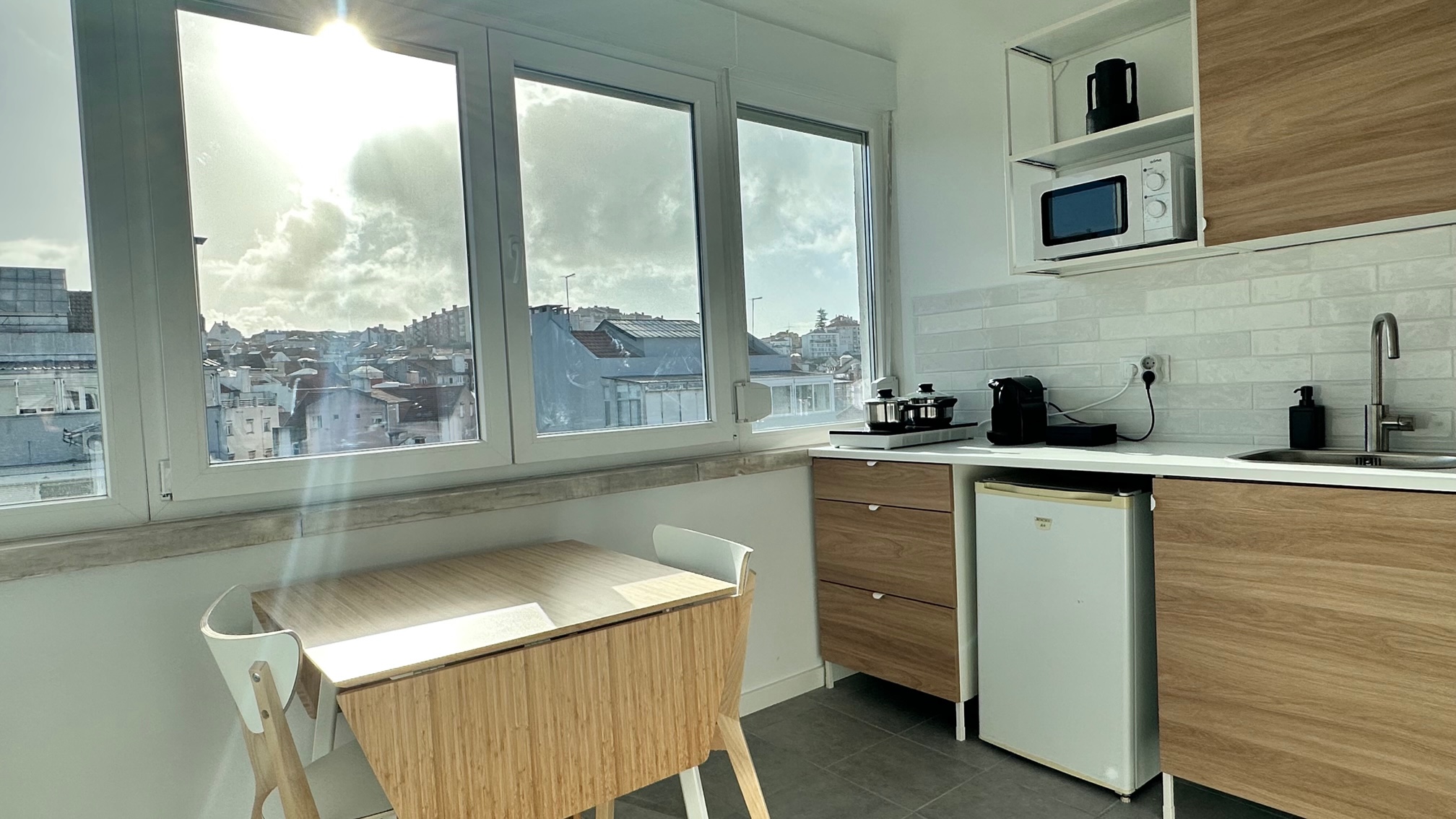 Nossos quartos têm uma confortável cama de casal, um sofá-cama e uma cozinha equipada com todos os itens essenciais que você precisa para uma estadia confortável, incluindo uma geladeira, micro-ondas, caldeira, fogão pequeno e máquina de café.